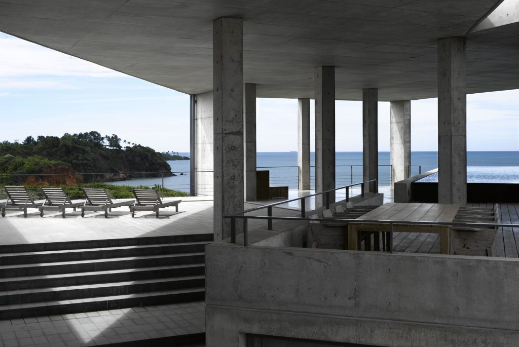 The house of Pierre and Saskia is located in Mirissa, the southern end of Sri Lanka. It’s made of two rectangular-shaped blocks which stand on the top of a cliff, parallel to each other. There is a pool on the roof and a workshop space added to the project.